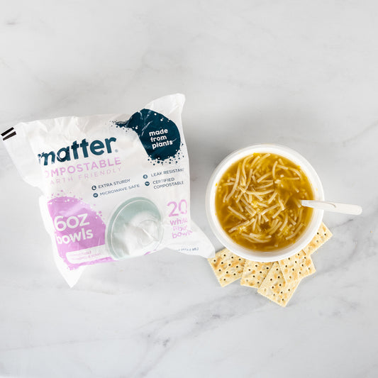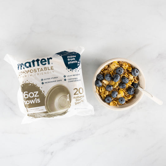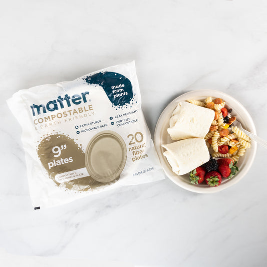 Matter plant-based fiber plates are sturdy and strong for big servings and look great – even with fancy meals! Our plates and bowls provide a high-quality sustainable option, and will fully compost in less than 12 months. They’re even Gluten Free, freezer safe and microwave safe.