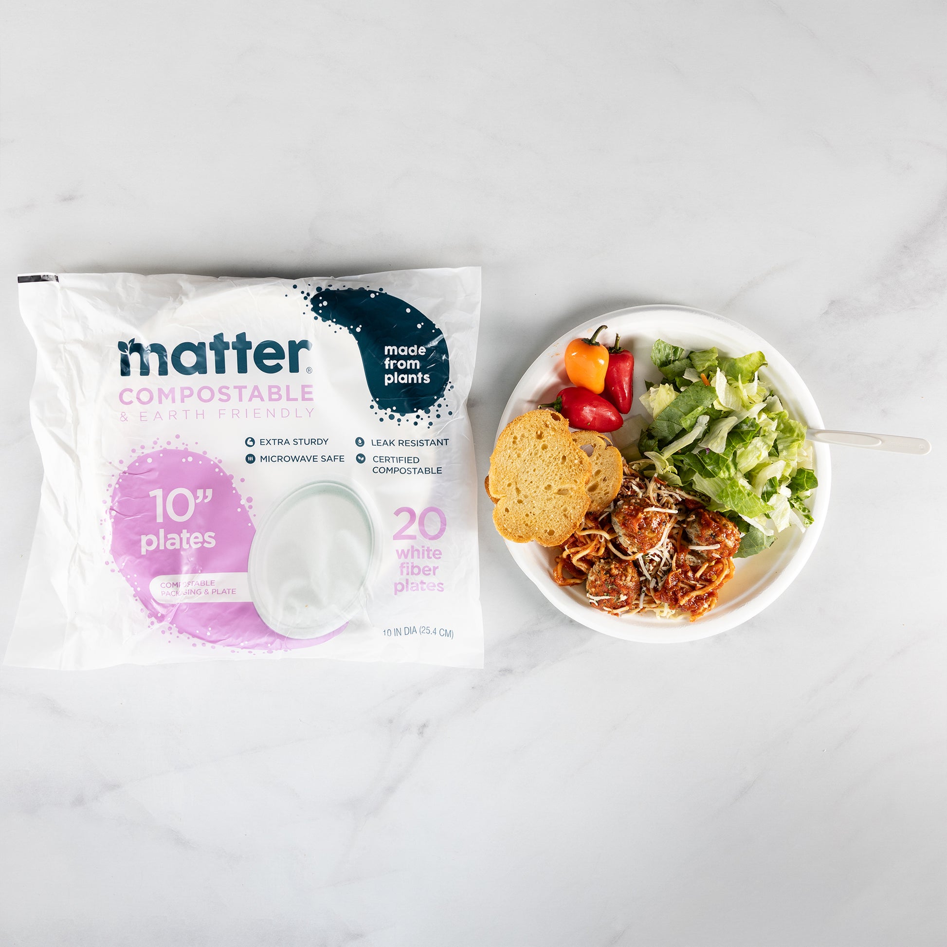 Matter plant-based fiber plates are sturdy and strong for big servings and look great – even with fancy meals! Our plates perform as well as plastic but will fully compost in less than 12 months.