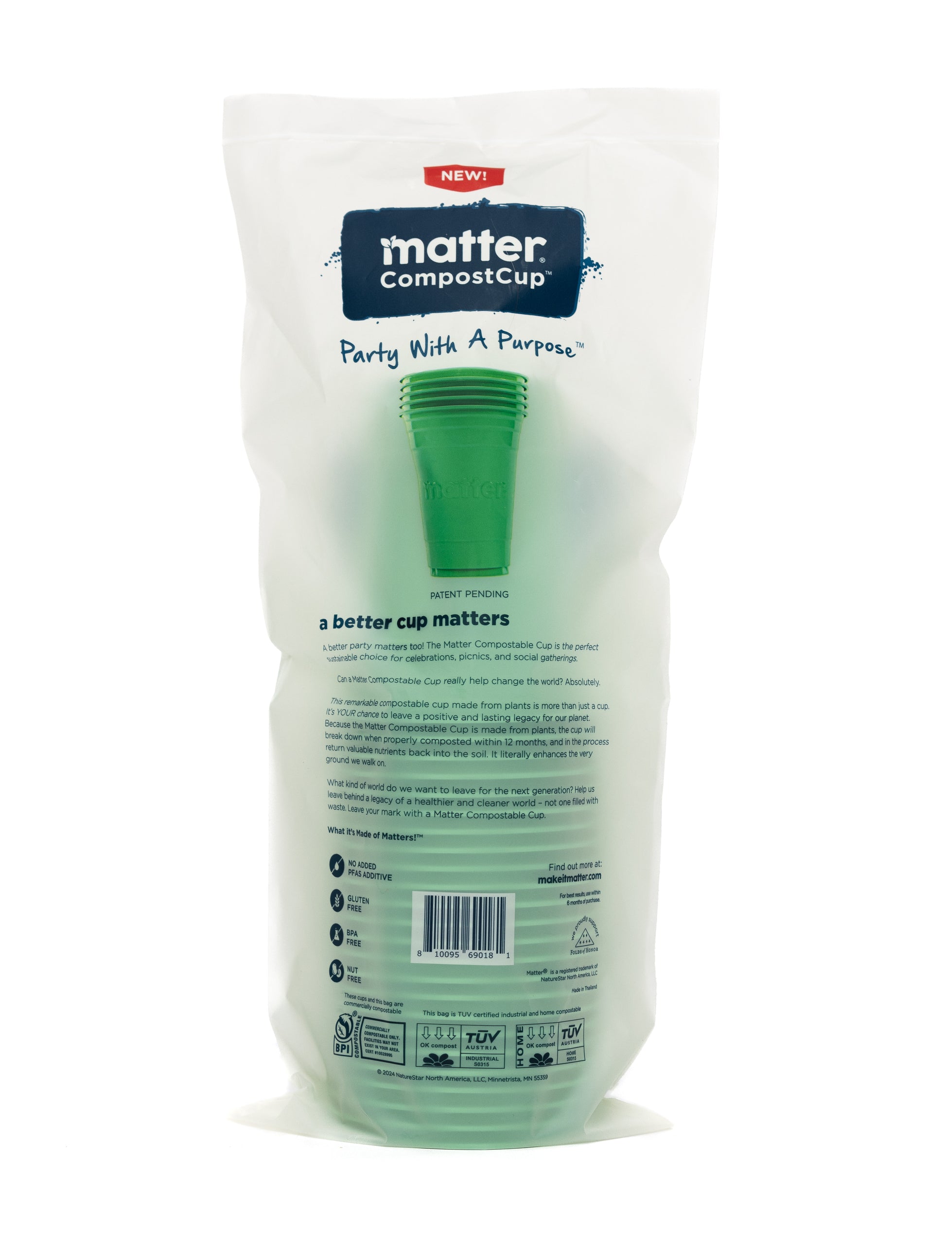 Matter CompostCups are BPI Industrial certified compostable; commercially compostable only (facilities may not exist in your area).