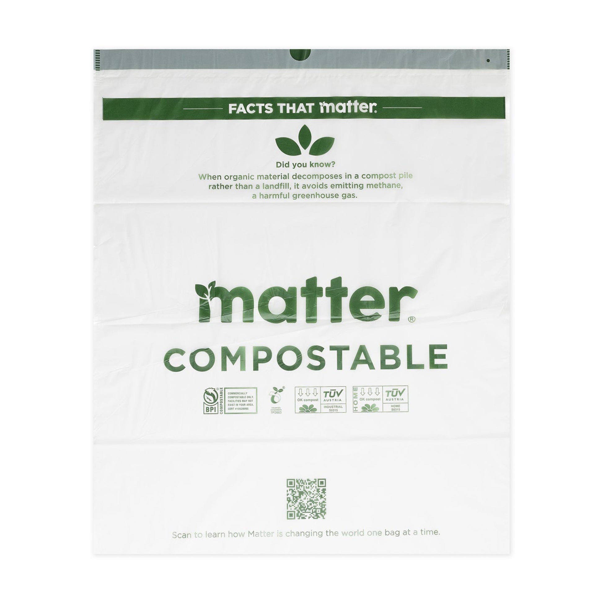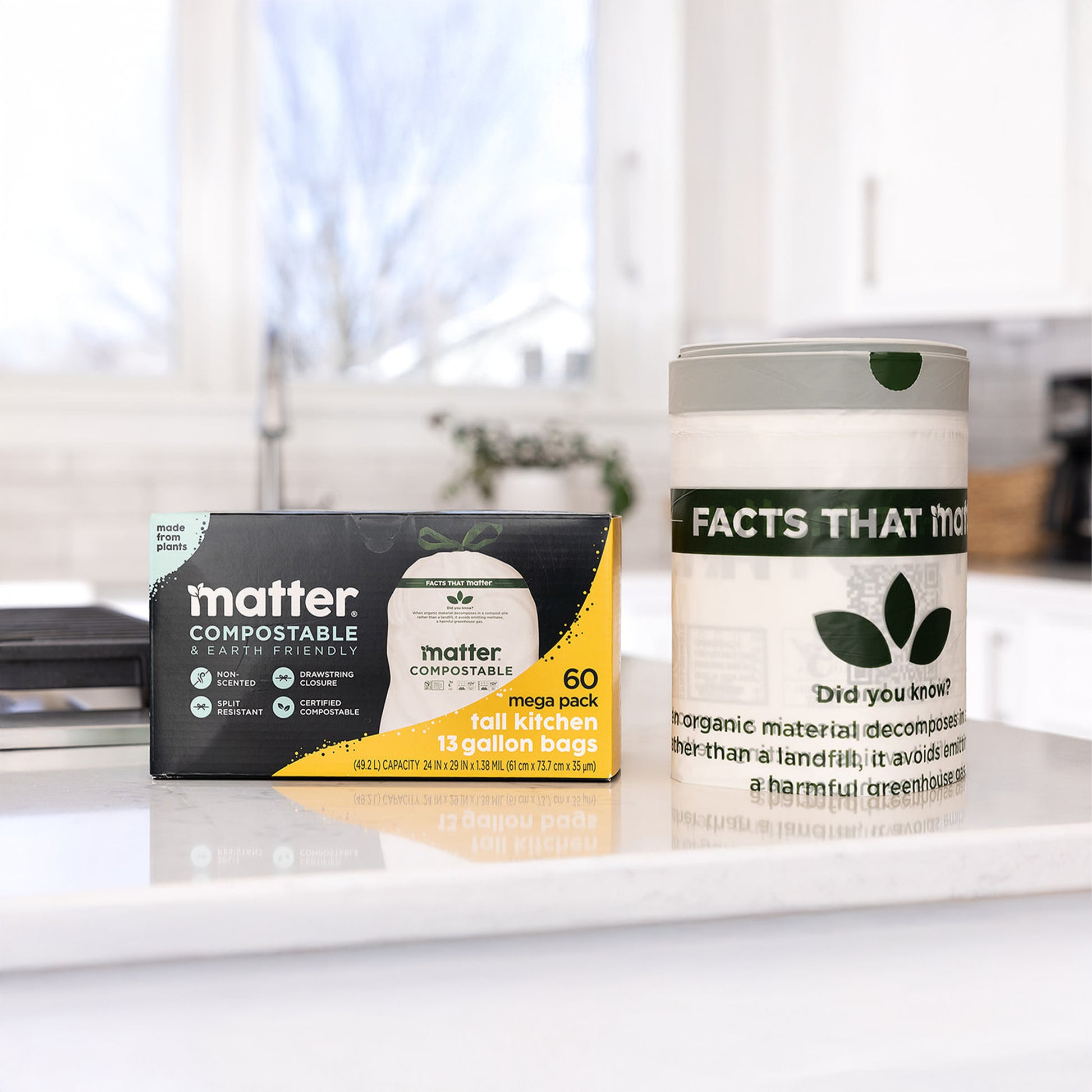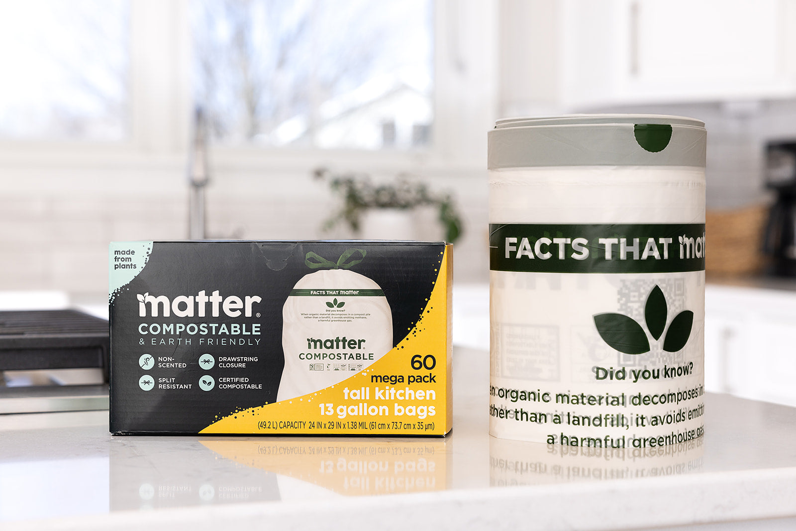 - Matter brand Tall Kitchen Waste Bags are compostable and fit 13-gallon waste cans