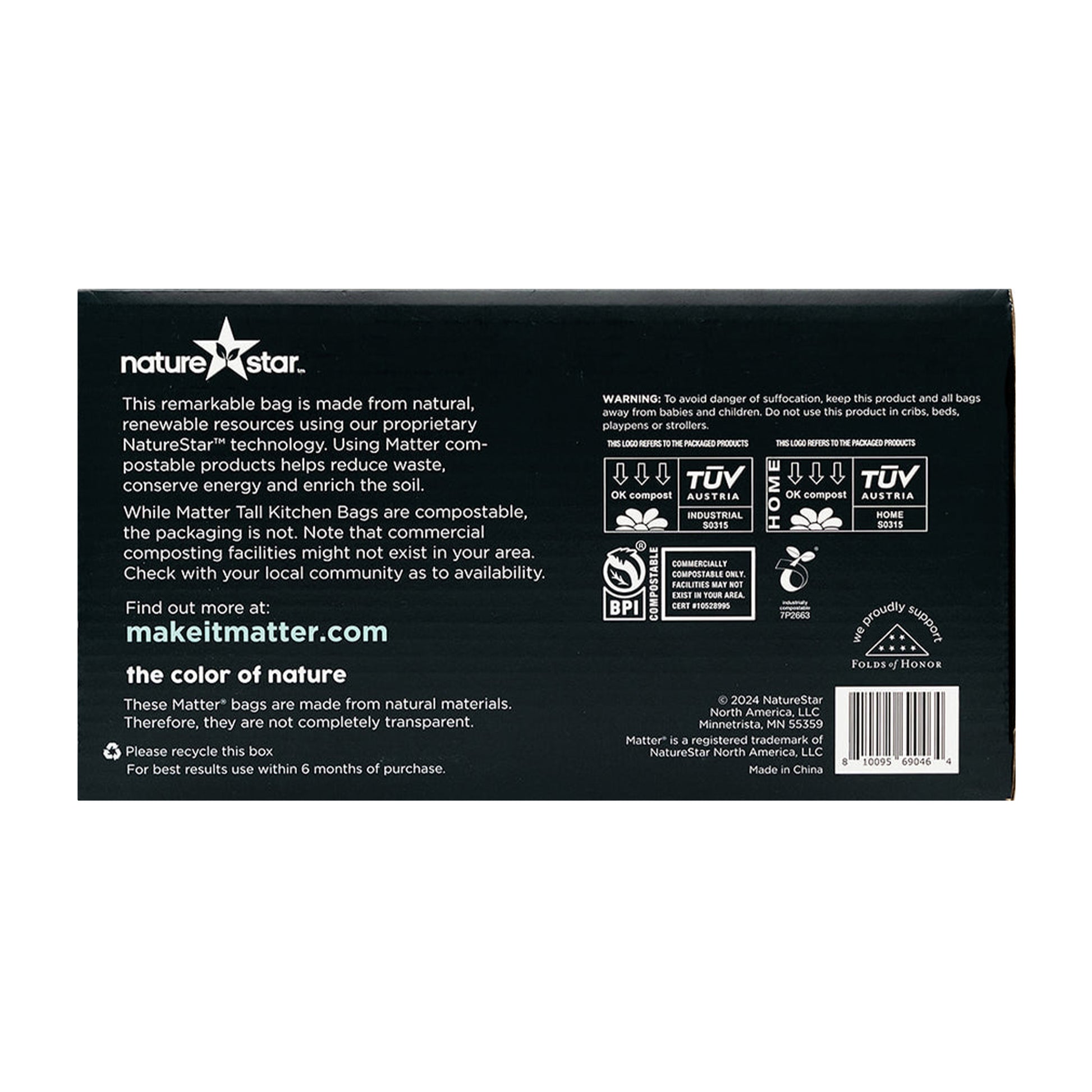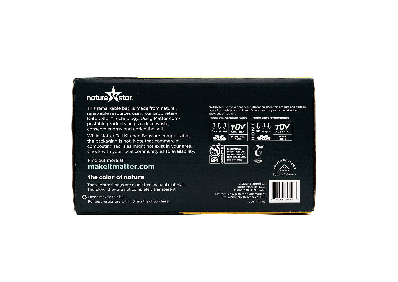 You don’t have to give up convenience or performance to be kind to the earth. Matter Compostable Drawstring Tall Kitchen Waste Bags have all of the strength you’ll ever need. When disposed of properly, our 13 gallon bags will fully compost within 12 months!
